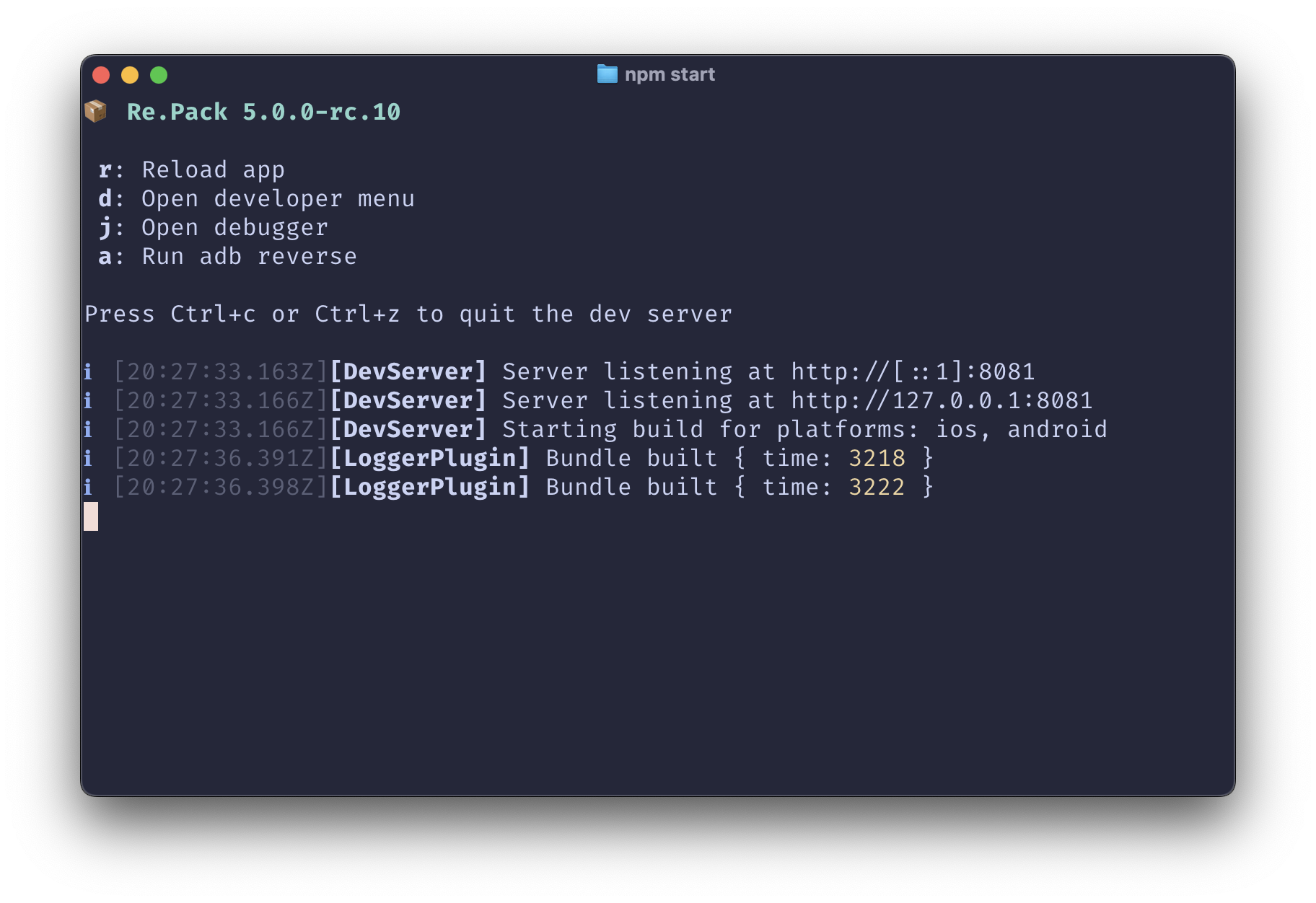 In the root of an existing React Native project with Re.Pack, run this command in your terminal of choice:
